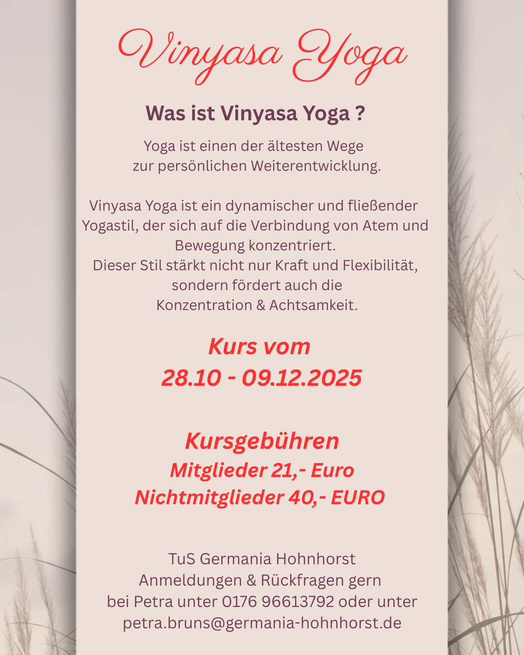 Sind Sie bereit, Teil einer lebendigen Gemeinschaft zu werden, die Ihre Leidenschaft für Sport teilt? Ob Sie sich für Tennis, Gymnastik oder unsere einzigartigen Kurse wie Yinyasa Flow interessieren, beim TUS Germania Hohnhorst ist für jeden etwas dabei. Verpassen Sie nicht unsere kommenden Veranstaltungen und die Chance, sich mit anderen Sportbegeisterten auszutauschen. Klicken Sie unten, um uns noch heute beizutreten und ein Teil unserer aufregenden Reise zu werden!